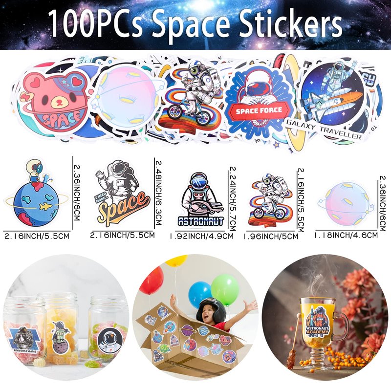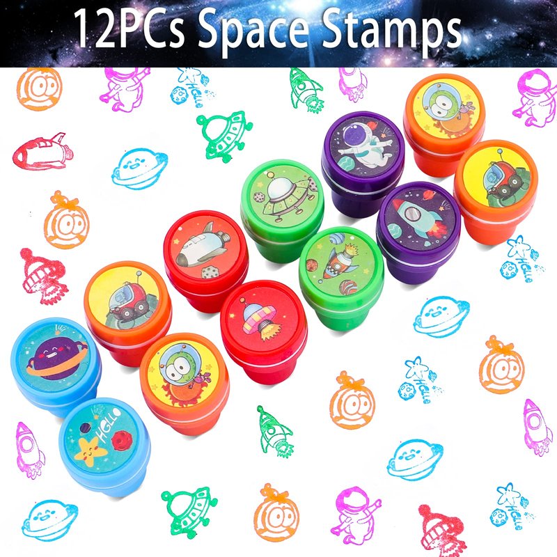 - OUTER SPACE PARTY FAVOR INCLUDED - 12pcs space stamp, 12pcs space slap bracelets(12 styles), 12pcs space rings(6 styles), 12pcs space keychains(6 styles), 12 sheet space temporary tattoos, 12pcs rocket flashlights keychains, 100pcs space stickers. Will be a great hit for kids party favors.