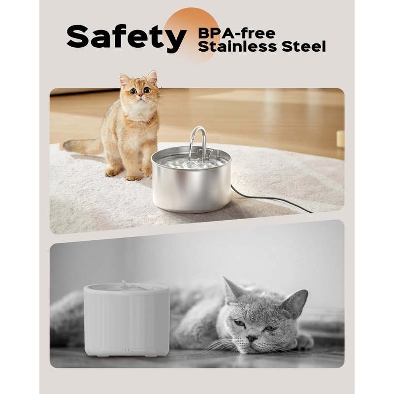 - 【304 Stainless Steel Material】Compared with plastic materials, the pet fountain made of stainless steel materials is more tough, better resistant to corrosion,longer service life, and no other material elements will penetrate into the water to ensure the safety of pet drinking water.
