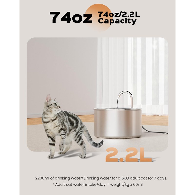 AOOGITF Cat Water Fountain, 304 Stainless Steel Pet Water Fountain, 24/7 Keep The Water Fresh, 74oz Capacity, Ultra-Quiet, No Sputter, Compact, Easy Cleaning, Suit for Pets