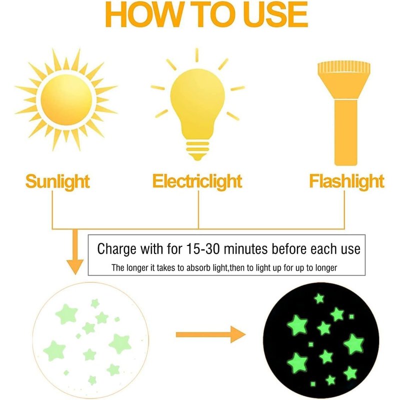 - ✦【LONG LENGTH OF GLOW】Just place on any clean, flat surface, and turn on the light for 15-30 minutes then off, because the stickers need to absorb light before glowing. The longer it takes to absorb light,then to light up for up to longer. After the series thing, there will be a glowing view in front of your eyes.The wall stickers hold by the use of a special adhesive film on any common surface easily.
