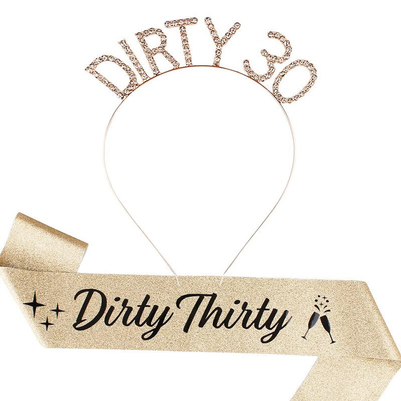 AOPRIE Dirty 30 Headband & Sash for Women Gold Birthday Tiara Crown Rhinestone Happy Birthday Hair Accessories Gift Sets