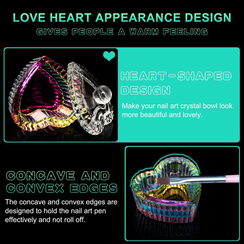 - What You Get--The dappen dish for acrylic nails package include 2pcs nails tips art dappen monomer dish with lid,which is designed with heart shape that makes your nail crystal bowl look more beautiful and cute.