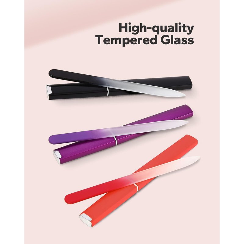 - 3 Pack for Durable and Gentle: Crafted from high-quality tempered glass, it do not corrode, rust. So this nail file provides durability for long-lasting use while maintaining a gentle touch to prevent nail damage. Come with 3 pack of crystal glass nail files (black + purple + red).