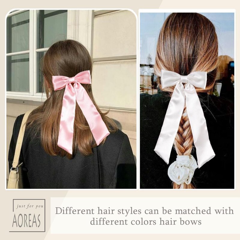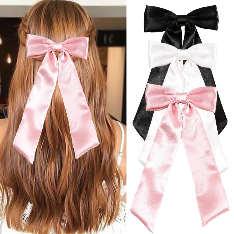 AOREAS 3Pcs Bowknot Hair Bows for Women Soft Silky Stain Bow Hair Clips with Long Tail,Black White Pink Bow Alligator Hair Ribbon Barettes Party Wedding Prom Daily Wearing Hair Accessories