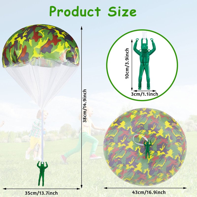 - Eye-catching design: these army camo parachute toys are featured with green and camouflage colors, which are eye-catching, interesting and charming, creating a visual impact to attract people's attention; The size is small for you easily to fold and roll up when you need to store it, and won't occupy space, you just need to put it in any corner