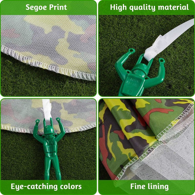 - Easy to operate: each camo throwing toy adopts a tangled-free design, no rope tangles and no extra links, you just need to roll up the parachute, then throw the parachute up high and wait for it to land; Reminder: please stay away from branches or roadside wires