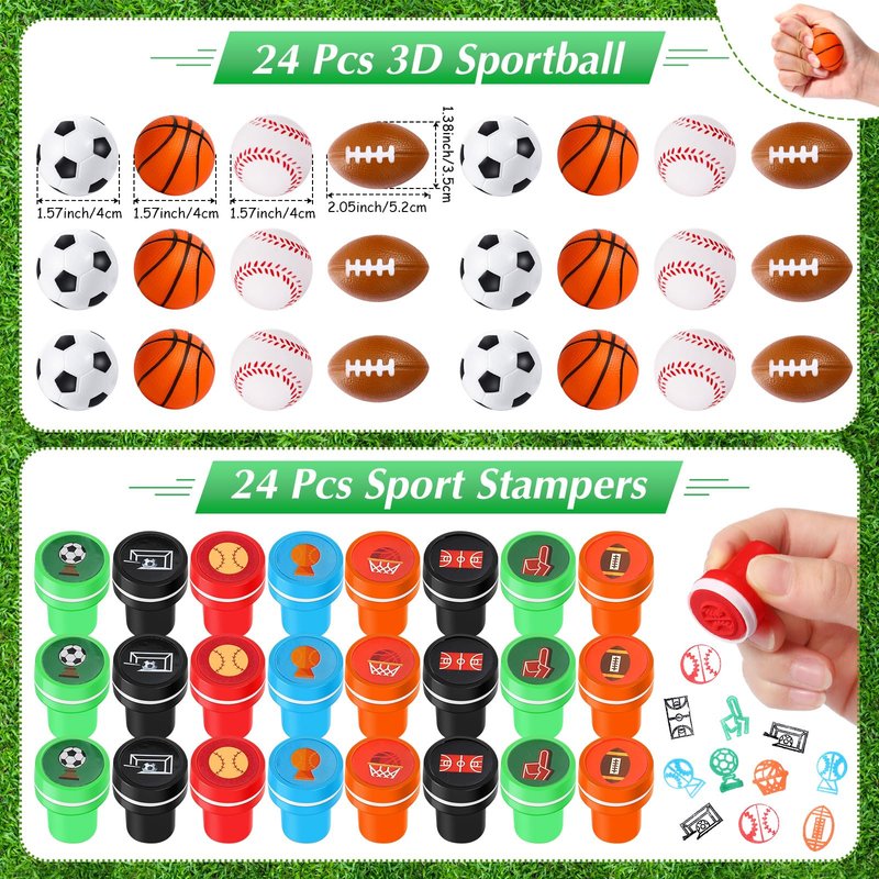 Aoriher 120 Pcs Sport Balls Party Favors Set Serve 24, Basketball Football Soccer Goodie Foam Finger Mini Stress Ball Slap Bracelet Charm Bracelet Stamp for Kids Party Supplies (Sports Ball)