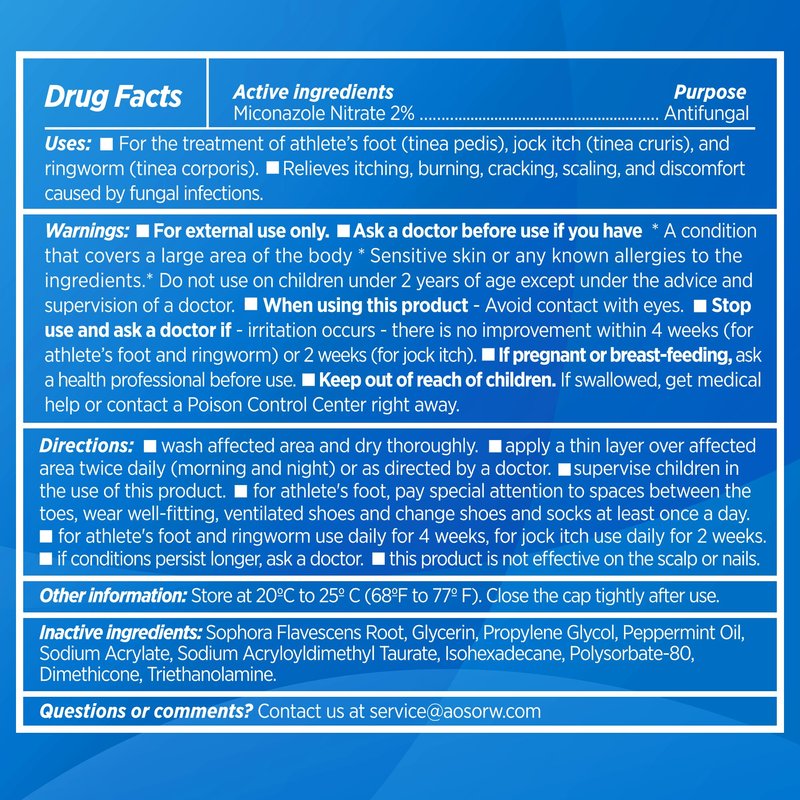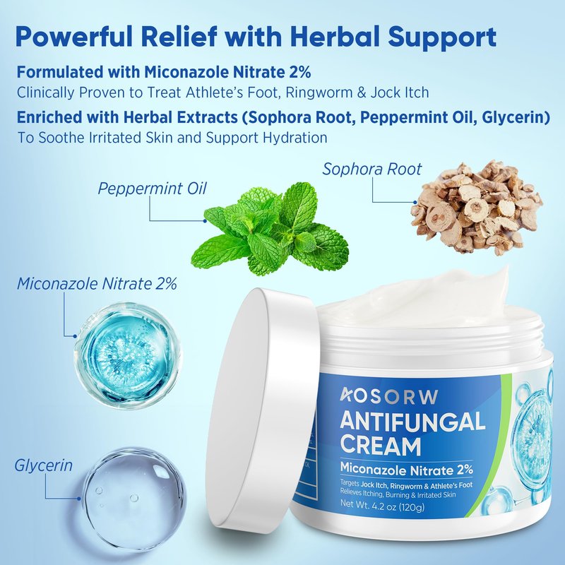 AOSORW Antifungal Cream features 2% Miconazole Nitrate, a widely used antifungal ingredient commonly used to help relieve symptoms associated with athlete’s foot (tinea pedis), jock itch (tinea cruris), and ringworm (tinea corporis). This cream is formulated to help soothe itching, burning, cracking, and scaling, promoting a more comfortable and healthier skin condition over time.