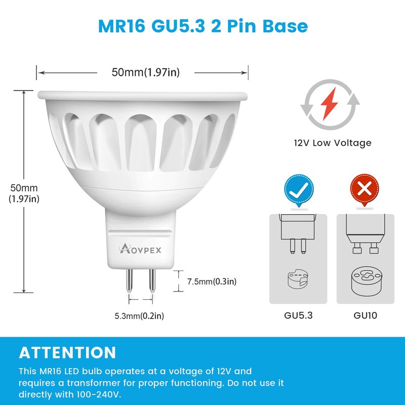 Aovpex 10 Pack Dimmable MR16 LED Bulbs, 12V 5W(50-Watt Equivalent), 3000K Warm White, GU5.3 Bi-Pin Base, 40-Degree, Indoor/Outdoor Landscape Spotlight Track Recessed Lighting