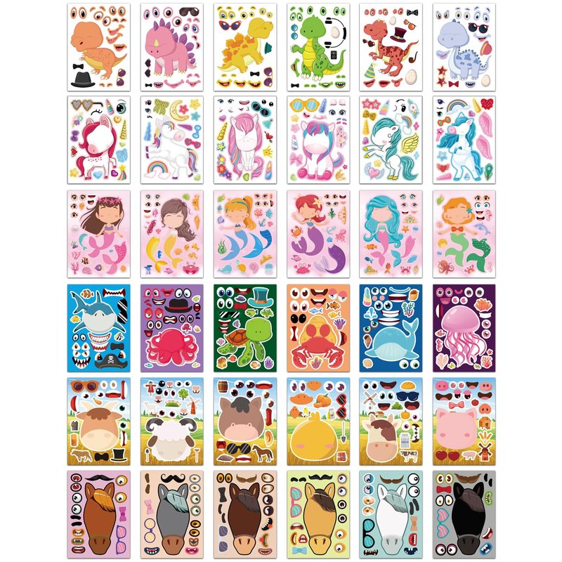 Aowplc 36 Pcs Make-A-Face Sticker Sheets Kids Party Favors Mix and Match Stickers with Dinosaurs, Mermaids, Unicorns, Horses, Farm & Sea Animals for Parties, Birthdays, Classroom Activities & Crafts