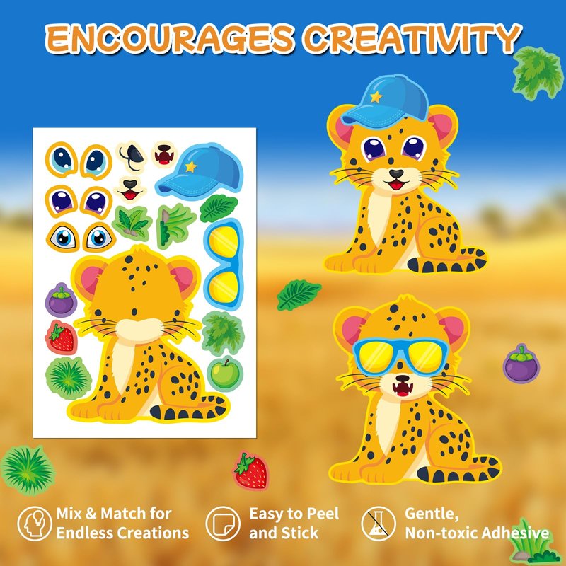 - Explore the Wild: With 48 MAKE-A-FACE stickers featuring 12 adorable safari and jungle animals, including lion, tiger, bear, panda, elephant, giraffe, monkey, gorilla, hippo, rhino, zebra and cheetah, each design comes with 4 sheets, unlocking the magic of wildlife in every craft project.