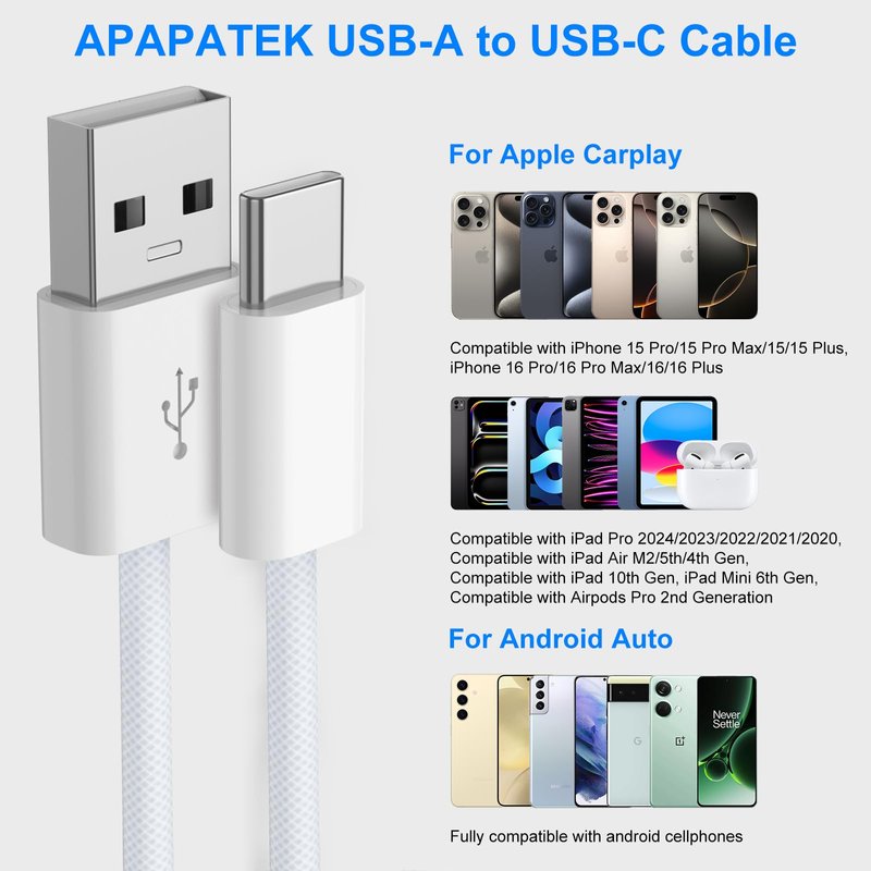 - Wide Compatibility: The USB-A to USB-C carplay cable compatible with iPhone 16 Pro/16 Pro Max/16/16 Plus, iPhone 15 Pro/15 Pro Max/15/15 Plus, iPad Pro M4 2024, 12.9-in iPad Pro 6th/5th/4th/3rd gen, 11-inch iPad Pro 5th/4th/3rd/2nd gen, iPad Mini 6th gen, iPad 10th gen, iPad Air M2/5th/4th gen, and for Samsung S24 S23 S22 S21 A55 A54, Pixel 9 Pro 8 7 6 Pro 8a 7a 6a 5 and more android smartphones.