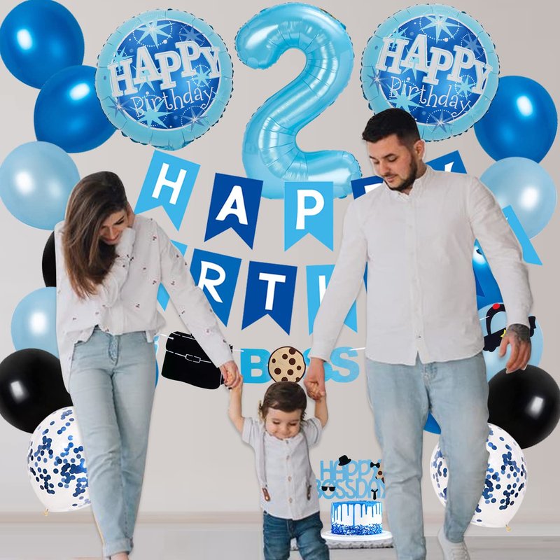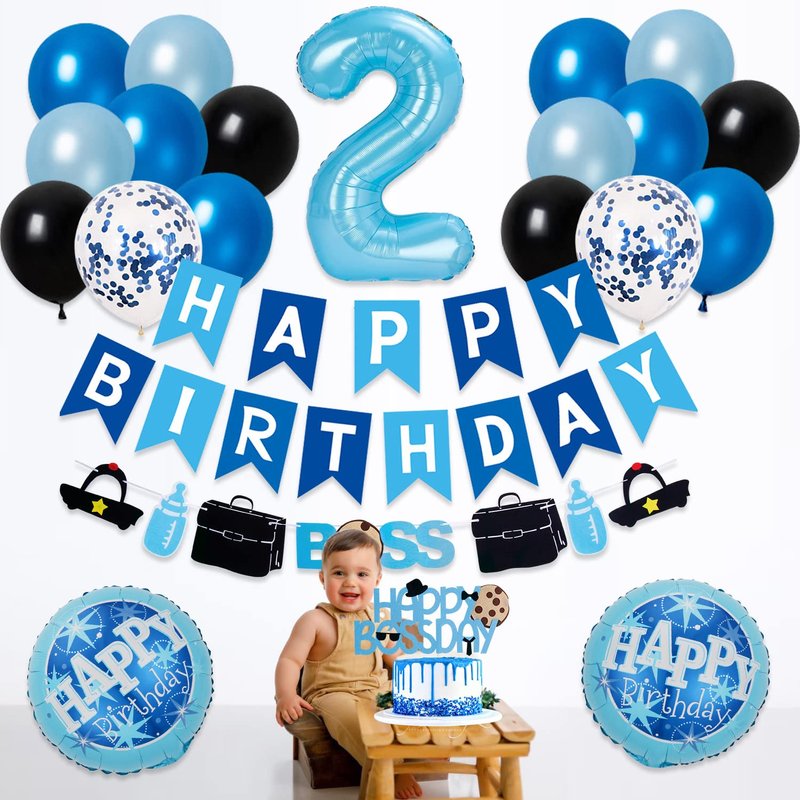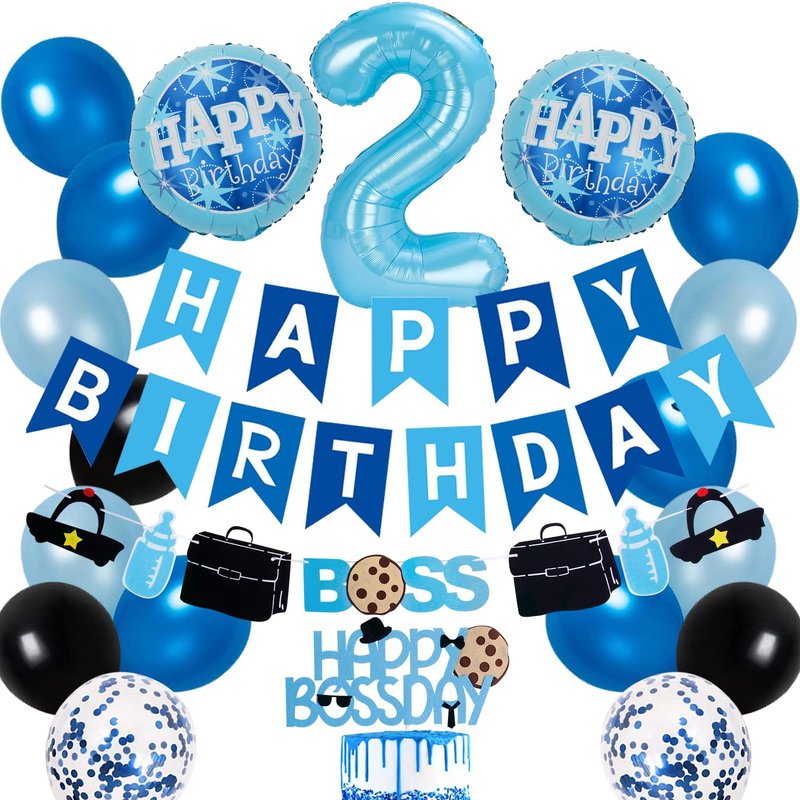 - Blue Black Boss 2nd Birthday Decorations including 1x pre-strung blue birthday banner, 1x pre-strung boss theme party garland, 1x Happy Boss Cake Topper, 1x 2nd birthday foil balloon kit, 1x blue black latex balloon pack.