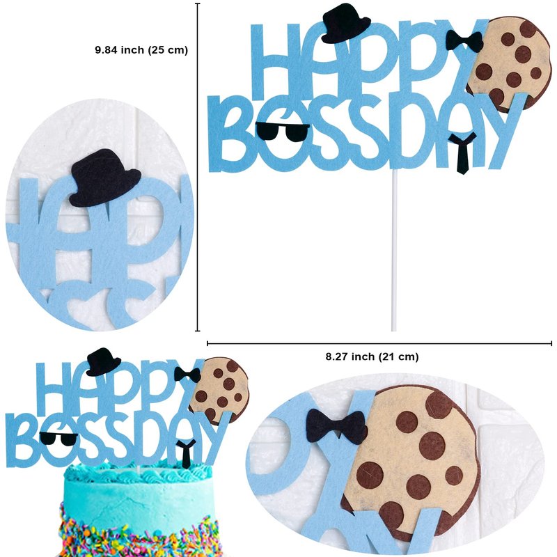 - The cute boss theme birthday cake topper is felt made, decored with hat,bow tie, eye-glass, and cookies, applies to boy 2nd Birthday Cake Decoration.