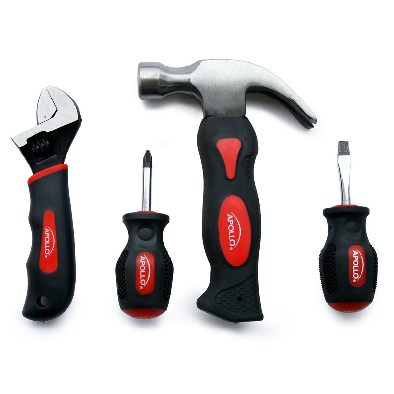 Apollo Tools 4 Piece Stubby Tool Set for Small Hands and Tight Spaces. Convenient and Compact Small Tool Set includes Mini Hammer, Mini Screwdriver Set and Mini Wrench - Red - DT0240