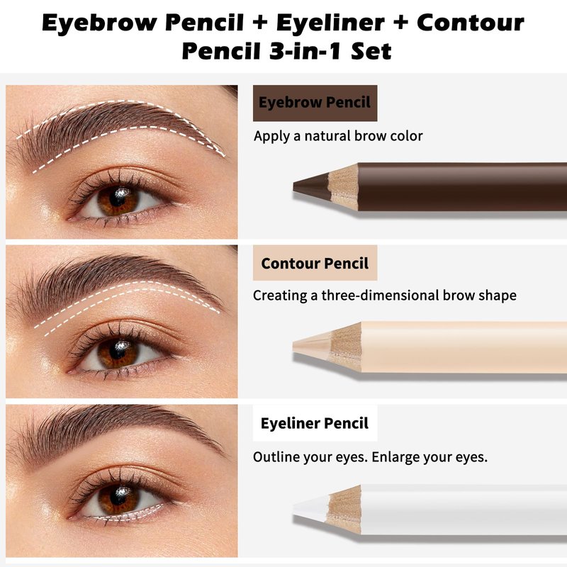 - 【Eyebrow Pencil Set】:1 eyebrow pen+ 1 white eye liner pencil + 1 contour(concealer) pencil, its perfect for defining the eye contour and line, easy to create a three-dimensional eye makeup.