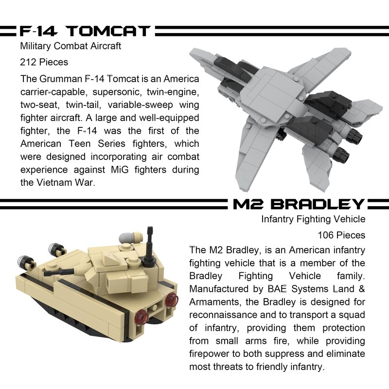 - Each vehicle has movable parts!: F/A-18 Hornet combat aircraft, F-14 Tomcat fighter jet, AH-64 Apache Helicopter, M2 Bradley tank, and Humvee Avenger air defense system