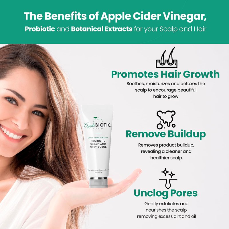 Introducing Applebiotic Apple Cider Vinegar Scalp Exfoliating Scrub — a new revolutionary solution to exfoliate, hydrate, and balance your scalp.