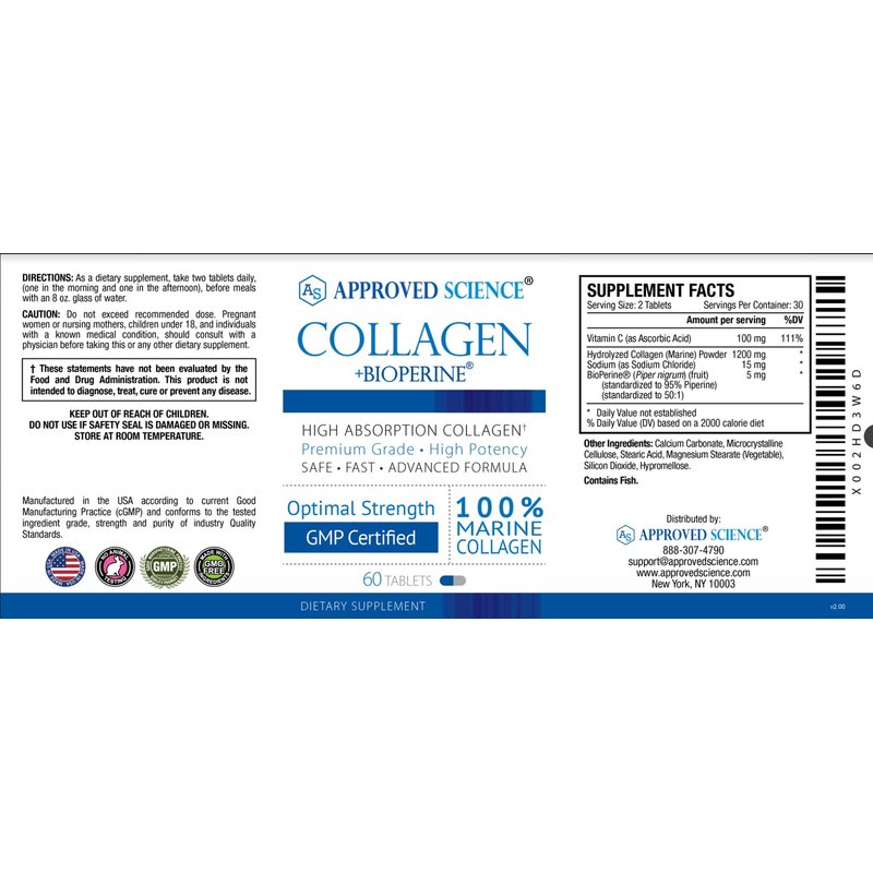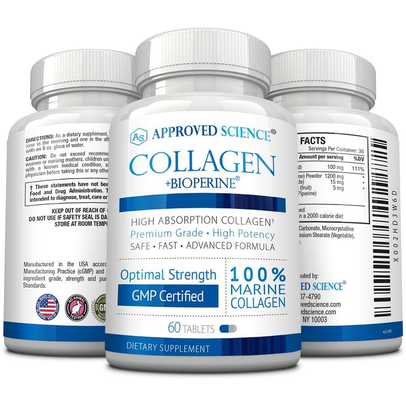 Approved Science Collagen Pills - Absorbable Marine Collagen Types I and III - 180 Tablets - Healthy Hair, Skin, and Joints - Vitamin C, Sodium, and Bioperine for Fast Results - Non-GMO, Made in USA