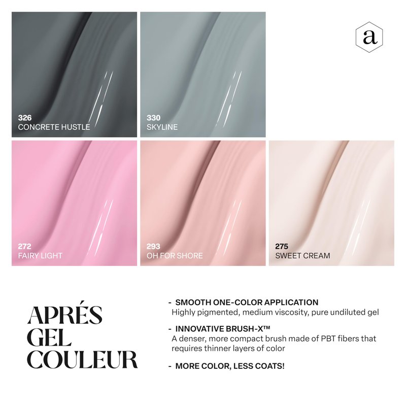 Create colorful French nails with Aprés French Manicure Gel. Create vivid one color, nail art, and everything in between with Aprés Gel Couleur. With a wide range of vivid shades, Gel Couleur provides multiple different ways to create flawless one-color services and pigmented nail art designs. This is the collection for the nail artist who wants range and versatility within their color arsenal without ever sacrificing in quality! Our pure gel formula creates a gel that’s both smooth enough for one color and opaque enough for nail art. And with Gel Couleur’s pure gel formula, there’s no tacky layer after curing. Worry less about fuzzies and smudges as you create a beautifully colorful set. And our revolutionary Brush-X is both a convenient tool for pros and a helpful aid for DIYers. No more separate art gel needed! Made from PBT fibers, Brush-X has the same dense and compact feel of a Japanese nail art brush.