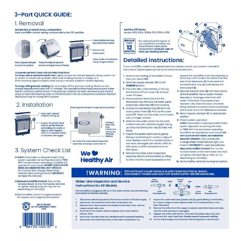 - FOR OPTIMAL PERFORMANCE replace your genuine AprilAire Whole-Home Humidifier Water Panel annually