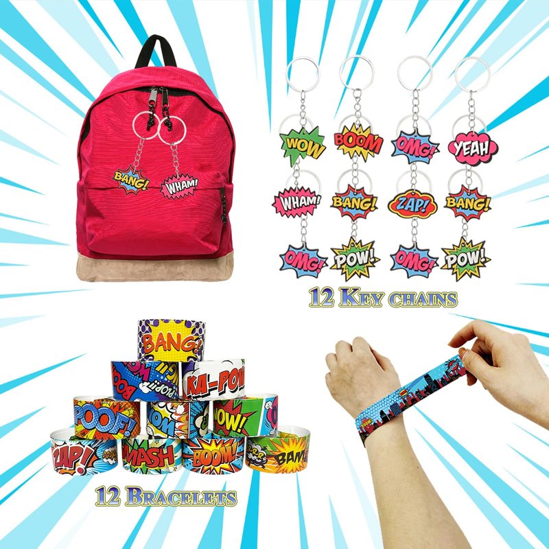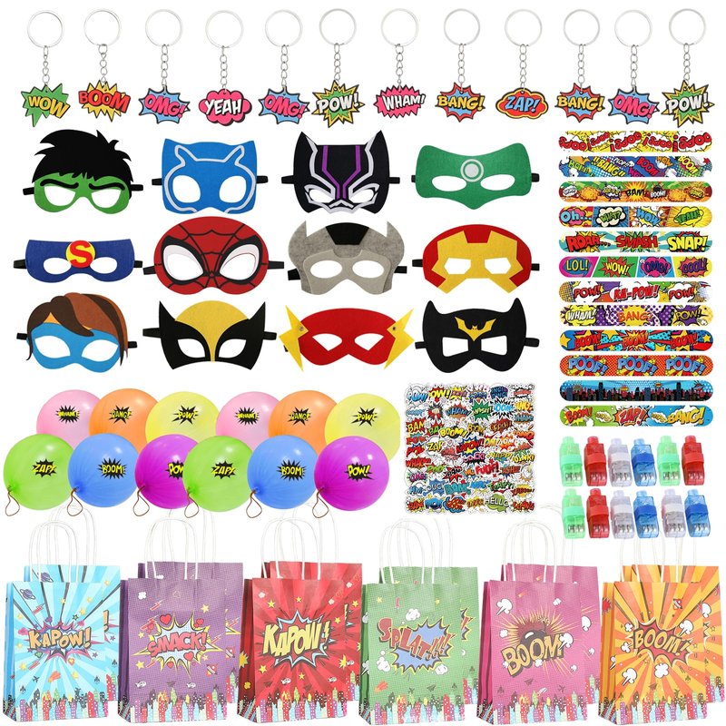 - 【122 Pcs Superhero Party Favors】 - This comprehensive set includes 122 pieces of high-quality superhero-themed party favors. You will receive 12 hero masks 12 hero punch balloons 12 finger lights 12 hero slap bracelets 12 keychains 50 stickers and 12 gift bags. Whether you're planning a birthday party, a classroom celebration, or a themed get-together, these party favors provide an extensive range of items to engage and entertain guests of all ages.