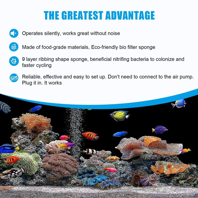 - 【MULTIPLE FUNCTIONS】 AQQA sponge filter with 9-layer ribbing shape sponge design, provide both mechanical and biological filtration, combines bio-filtration, oxygenation and physical filtration in one. The sponge can absorb fine particles to achieve the effect of purifying water, and the outlet can rotate 360 degrees without dead ends, provide the most suitable living environment for your fishes