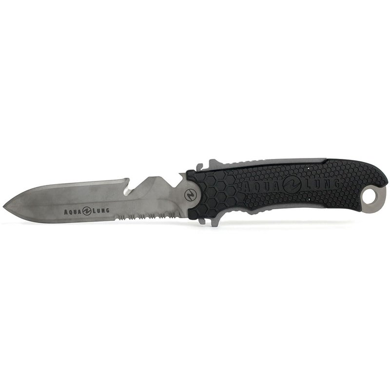 The Aqualung Big Squeeze Sheepsfoot Knife is a heavy-duty, no-nonsense knife that's designed specifically for scuba diving. The innovative squeeze lock design holds your knife securely in place while also providing rapid access with a simple handle squeeze. The 4.5" sheepsfoot blade is great for hammering and pounding and allows you to perform quick, controlled cuts without worrying about puncturing or stabbing anything. Plus, it comes with a line cutter and partially serrated bottom for cutting rope or netting. Easy-to-use squeeze lock design with sheath 4.5" sheepsfoot blade with line cutter and partially serrated bottom Durable nylon and fiberglass handle provides a secure grip Various mounting options (leg strap channels, built-in BC connection points, 2” locking clip) Rugged 304 stainless steel construction Measures 9.5"L overall