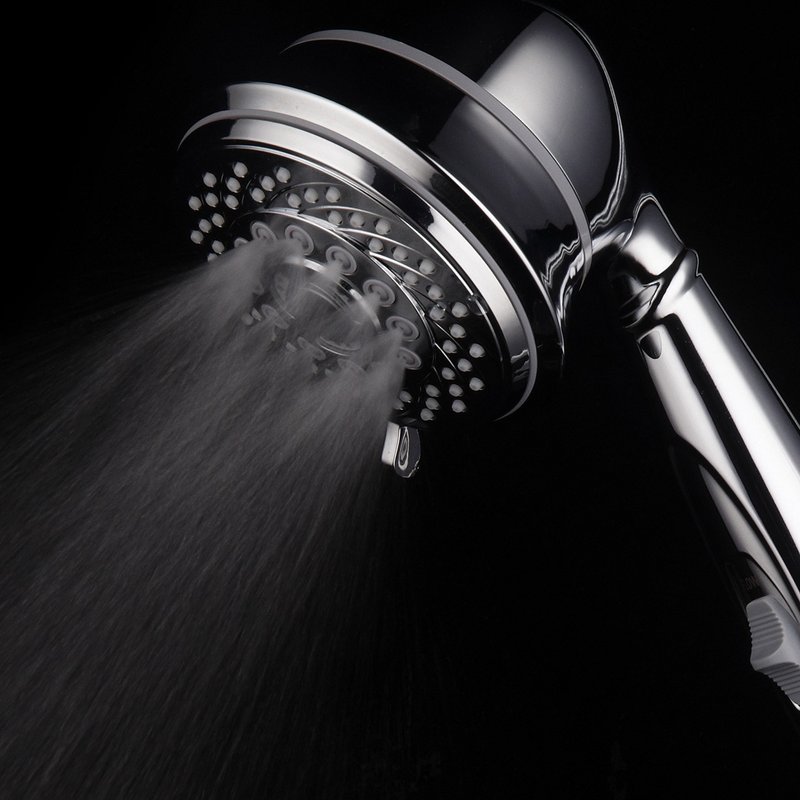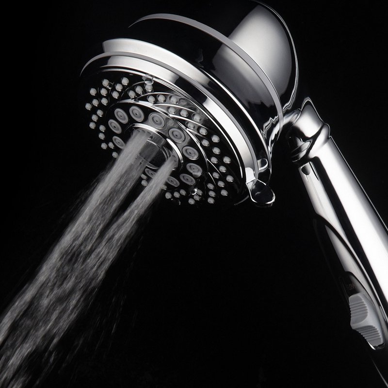 - HANDHELD SHOWERHEAD: Hotelspa 7 Setting Spiral 4 inch Chrome Face Hand Shower with Patented Pause Switch - The Ultimate in Flow Control and Mobility! | 7 High-Power Settings include: Power Rain, Massage, Soft Aeration, Rain/Massage, Rain/Aeration and Water-saving Economy Rain and Pause modes | Oversize 4" Chrome Face | 3-zone Precision SpiralFlo Click Lever Dial | Rub-clean Jets