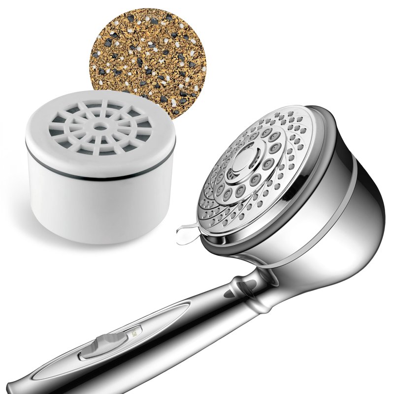 - HANDHELD SHOWER HEAD WITH SHOWER FILTER SYSTEM: The latest in showerhead style and performance PLUS purified shower water! This luxurious shower system is the best in shower head design with the latest in shower water filtration technology. High-Power 6-setting Showerhead with Enriched KDF/Active Carbon Shower Filter delivers an amazing shower HotelSpa experience
