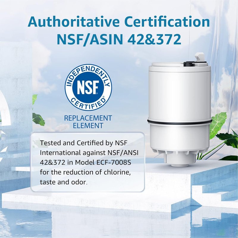 - [NSF certifications] Tested and certified by NSF International against NSF/ANSI standard 42 for the reduction of chlorine, taste and odor, and to NSF/ANSI 372 for lead-free material. For detailed NSF certification information: Visit the NSF official website, type " AQU-CF08B" into "Brand name/ Trade name/ Model" bar and click the "Search" button.