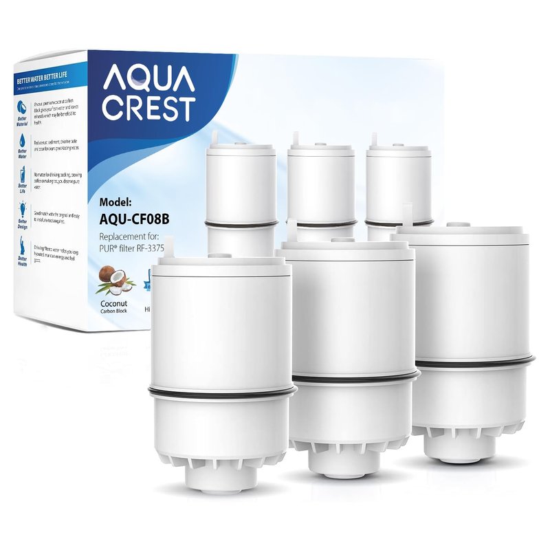 AQUACREST RF3375 NSF Certified Water Filter, Compatible with Pur RF-3375 (RF33752V2) Faucet Replacement Water Filter (Pack of 3, Packing May Vary),Model No.: AQU-CF08B Note: Please soak the filter in clean tap water for 3 minutes to flush the filter and release the bubbles before using. [NSF certifications] Tested and certified by NSF International against NSF/ANSI standard 42 for the reduction of chlorine, taste and odor, and to NSF/ANSI 372 for lead-free material. For detailed NSF certification information: Visit the NSF official website, type " AQU-CF08B" into "Brand name/ Trade name/ Model" bar and click the "Search" button. [High-efficiency filtration] AQUACREST faucet water filter uses premium natural coconut activated carbon block with a reduction rate of chlorine up to 97.2%. By its outstanding filtration performance, the filter can effectively reduce sediments, large particles, rust, taste and odor, which are tested by a third lab, to improve the drinking experience. (The activated carbon is made from natural coconut shells. Please confirm whether you are allergic to it.) [Long-lasting service life] This filter has a long-lasting service life. Please replace the filter every 3months to enjoy healthy drinking water, and please note that the specific replacement time may vary based on water quality. [Stronger water flow] AQUACREST faucet filter meets the requirements of both high efficiency and rapid filtration without waiting for premium filtered water. [High quality&standard] Our filter is designed to be perfectly fit and compatible with an original filter without sacrificing the quality and standard.
