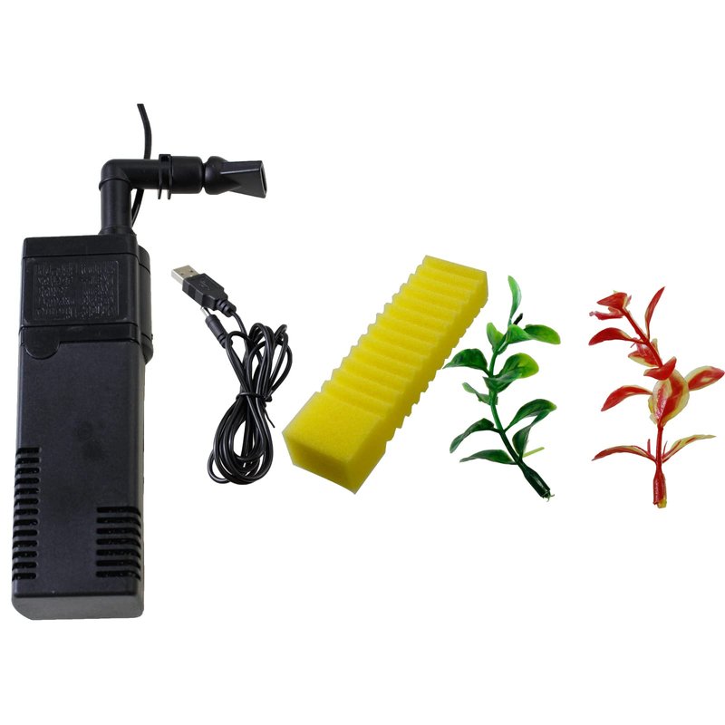- Complete starter kit: 1x 1.2 gallon Fish tank, 1x Sponge, 1x Water Filter, 1x 5V USB Power Cord, 2x Artificial Plants The filter MUST be fully submersed under water.