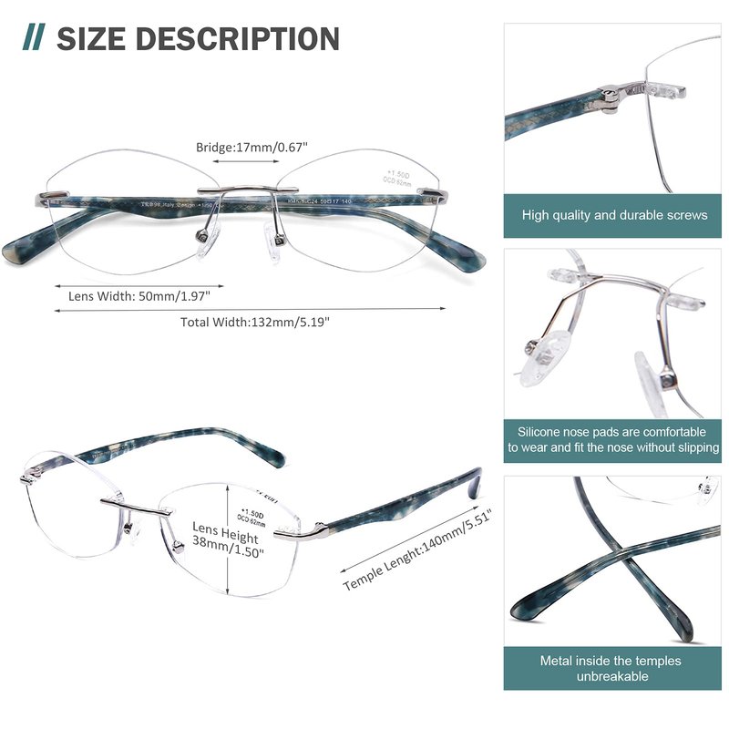 - DIMENSION - Lens width: 50mm, Lens height: 38mm, Bridge: 17mm, Frame total: 130mm; Arm: 140mm