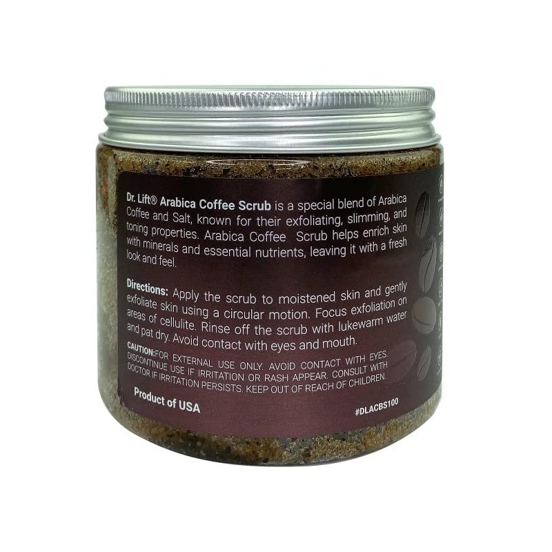 Awaken your skin with invigorating arabica coffee scrub. Dr. Lift Arabica Coffee Scrub is a special blend of Arabica Coffee and organic oils, known for their exfoliating, slimming, and toning properties. Arabica Coffee Scrub helps enrich skin with minerals and essential nutrients, leaving it with a fresh look and feel. Directions: Apply the scrub to moistened skin and gently exfoliate skin using a circular motion. Focus exfoliation on areas of cellulite. Rinse off the scrub with lukewarm water and pat dry. Avoid contact with eyes and mouth.