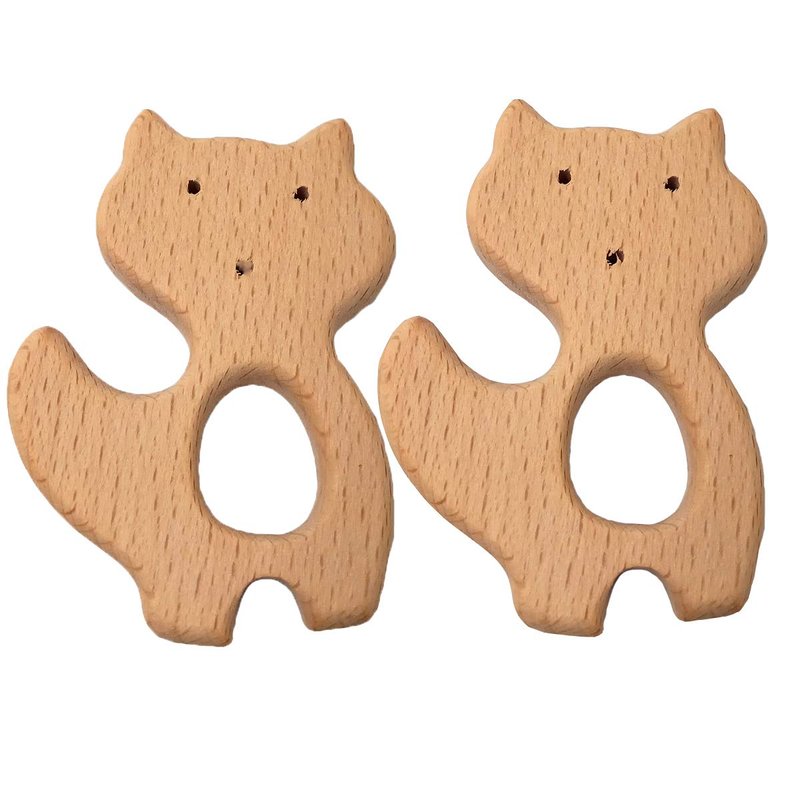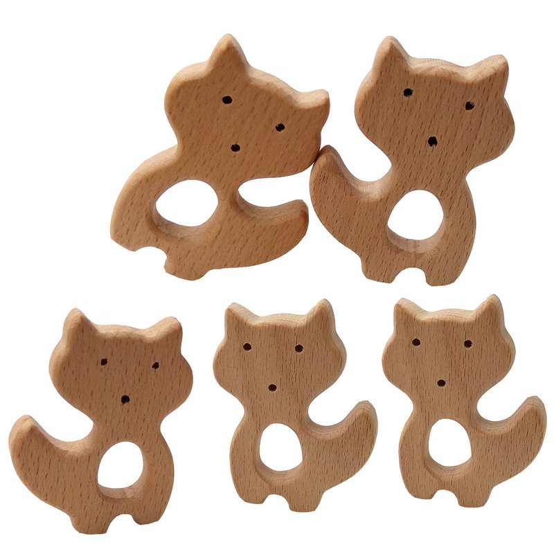 Arakierst 10pcs Organic Wood Fox Teether Pure Natural Animal Shape Beech Wooden Handmade Grasping Pattern DIY Pacifier Chain Pendant