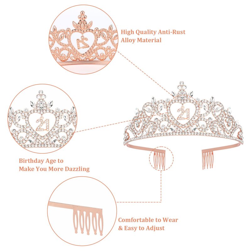 - Comfortable to Wear: The width of the 21st birthday tiara for women can be adjusted according to the shape of your head, The birthday crowns for women size is: 2.36*5.31 inch, one size fits most head sizes. In addition, the smooth edge will not squeeze the skin and is very comfortable to wear. It won't come off easily even when dancing at a party.