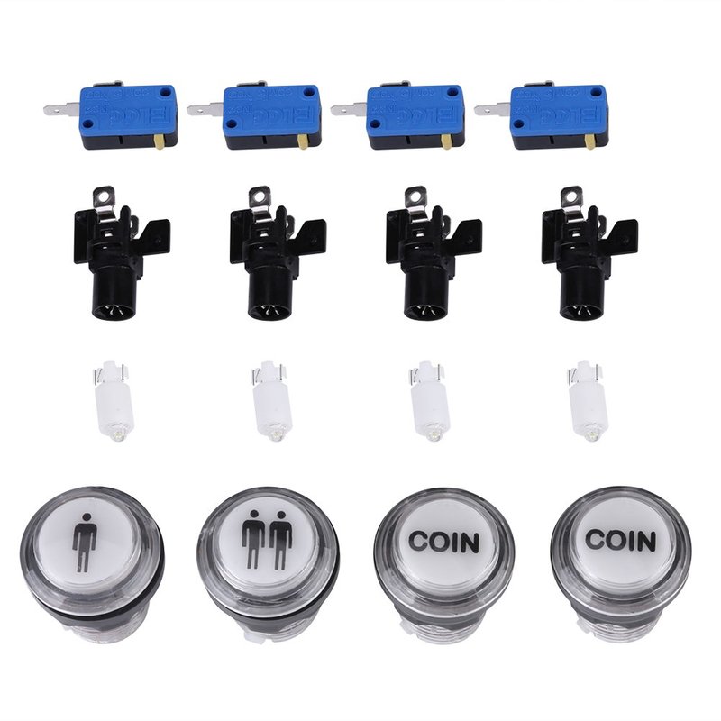 - [Complete Set] This kit includes 1 x '1p' led push button, 1 x '2p' led push button, 2 x 'coin' led push buttons, 4 x lights, 4 x micro switches, and 4 x supports.