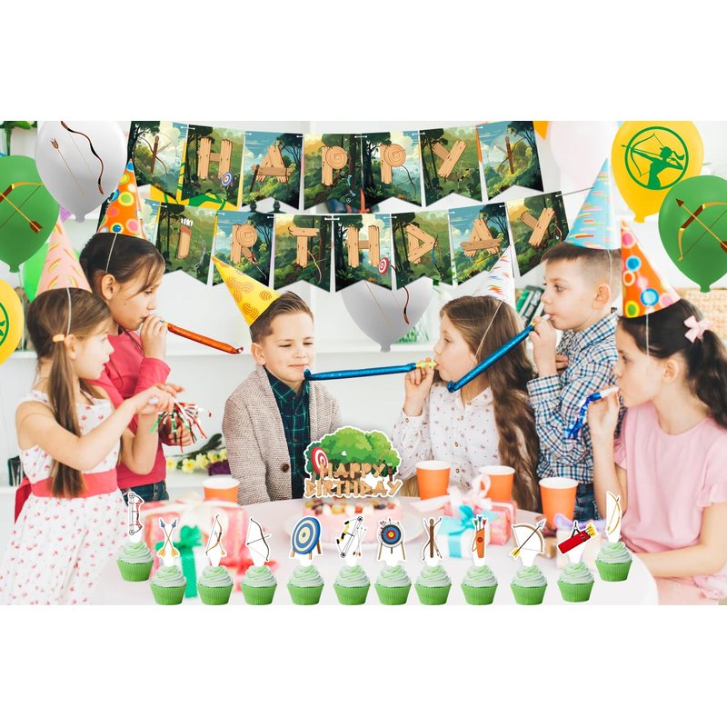 - Archery Party Decorations: Package includes 1* HAPPY BIRTHDAY banner, 1* HAPPY BIRTHDAY cake topper, 12* archery cupcake toppers, 18* archery balloons, 1* ribbon. Enough quantity to meet your archery party decoration needs