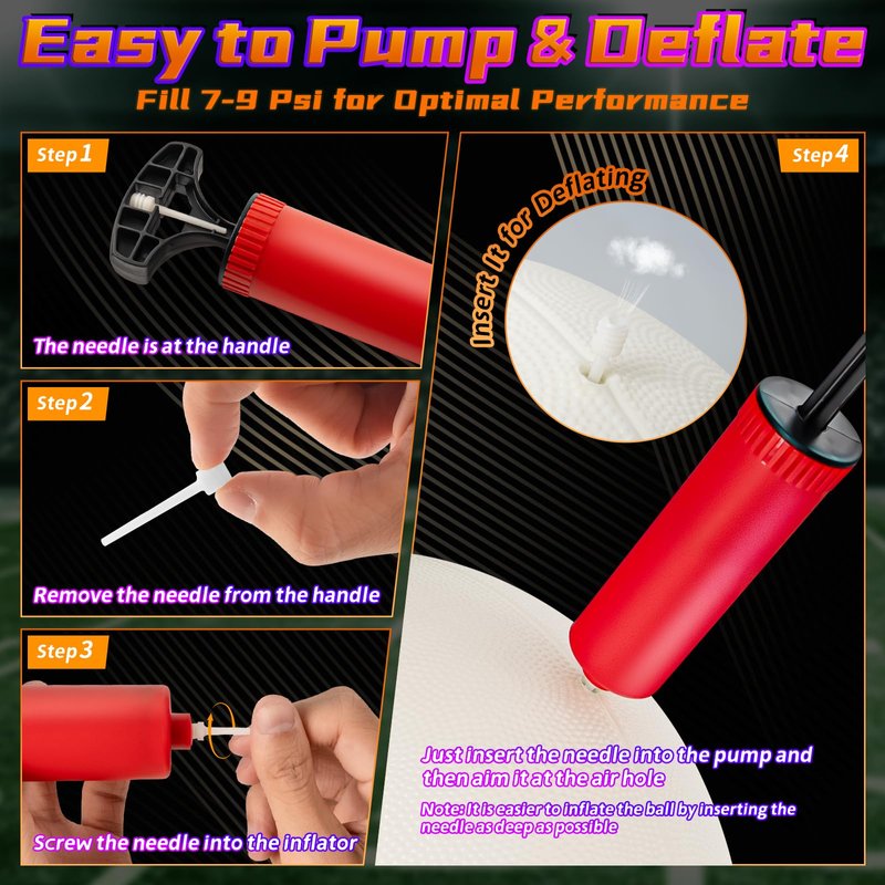 - Fully equipped for play: The football toys comes with everything you need for an instant game: a portable pump with an integrated needle, a USB charging cable. The manual pump can be quickly inflated and deflated for easy storage and transportation, making it a great choice for outdoor activities and family fun. Note: Inflate to the recommended 7-9 psi for optimal performance
