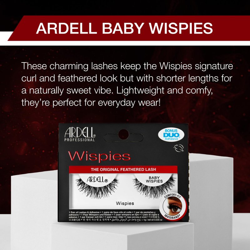 - Mini Feathered Delight: Meet the Baby Wispies, the mini version of Ardell Wispies! Enjoy the same signature feathered look in a shorter length for a natural yet captivating effect that enhances your eyes.