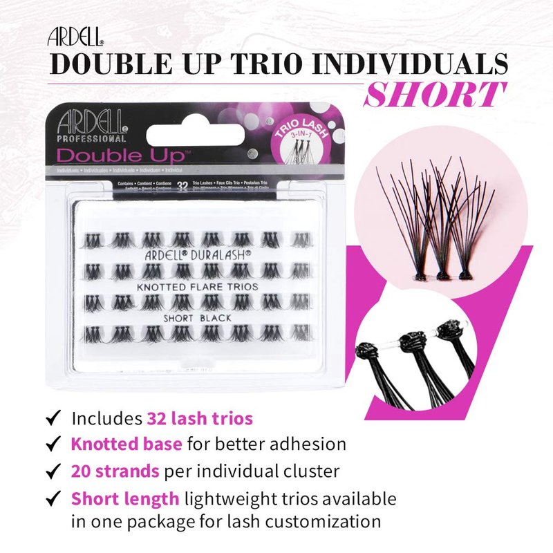 - TRUSTED BY THE PROS: Ardell Double Trio Individuals Short Black have taken a makeup artist favorite and lash wearer trick, custom stacking, and done the work for the wearer. It is reworked to provide the ultimate professional look for the eye-opening and soft effect you long for! These falsies will bring out and emphasizes the lash line, that you will instantly fall in love with these lash extensions!