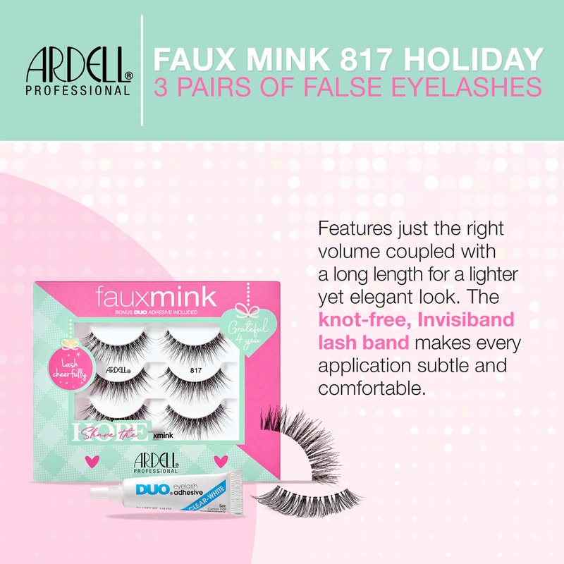 - Special Gift Set Packaging: Contains 3 pairs of Ardell Faux Mink 817 Lashes per pack. Comes in an exclusive holiday design packaging for easy gift ideas. Easy to apply and can be reused multiple times with proper care.