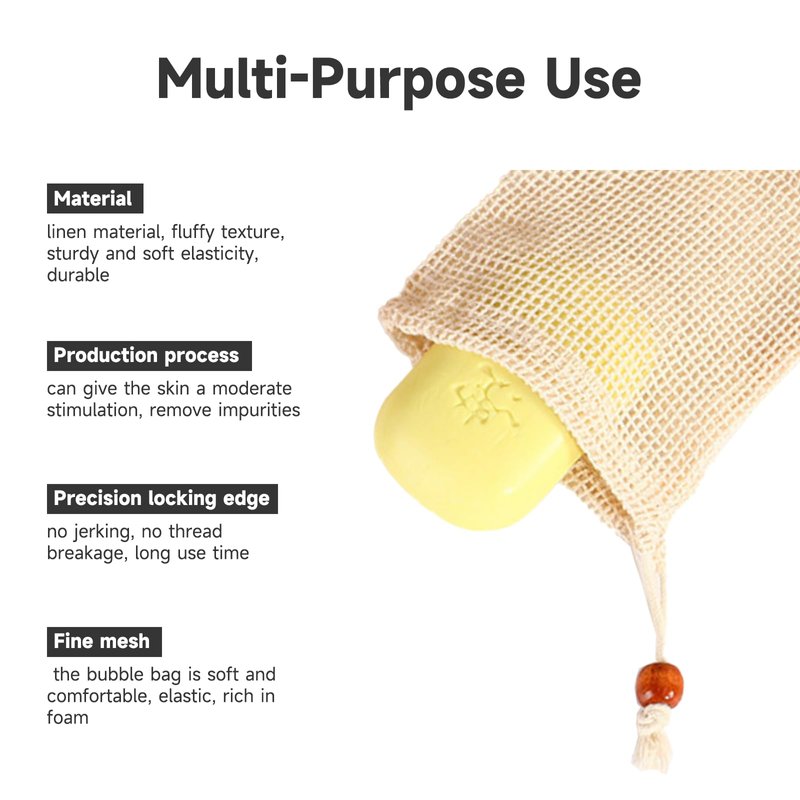 Features< br > Material: Natural cotton and linen. < br > Dimensions: 14.5 x 9.5cm / 5.7 x 3.7 inches. < br > Package includes: 20 packs of natural cotton and linen soap bags in total. < br > Produces rich and fine foam to gently remove oil and dirt from skin. < br > Drawstring design, can be dried after use, clean and hygienic. < br > Maintain good light friction to remove grease and dirt, stimulate the face, arms and other parts, bringing refreshing and fun to bathing. < br > Warm reminder: < br > When using, soak in warm water for two minutes to make the fabric soft and delicate. < br > Some products may have a bit of vegetable oil smell, please spread it out. < br > Wash after use and dry in a ventilated place or in the sun.