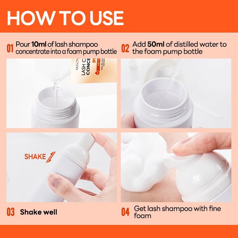 - LASH SHAMPOO CONCENTRATE: This product is an eyelash cleaner concentrate, configured with distilled water in a ratio of 1:5 to make a daily eyelash cleaner, i.e. 10 ml of concentrate with 50 ml of distilled water. The set can make at least 3 bottles of 60ml shampoo.