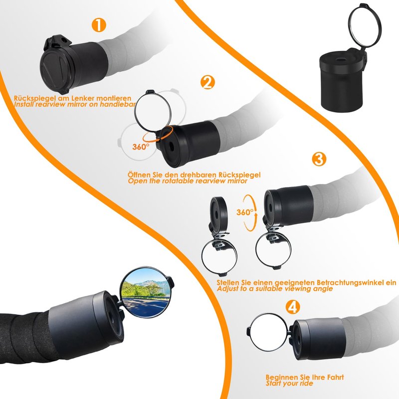 - 360 Degree Lens Rotation: This handlebar mirror can be rotated 360 degrees in two dimensions, allowing you to quickly and easily adjust the field of view for greater performance and safety. When closed, the mirror's lenses are safely tucked away from scratches and scrapes.