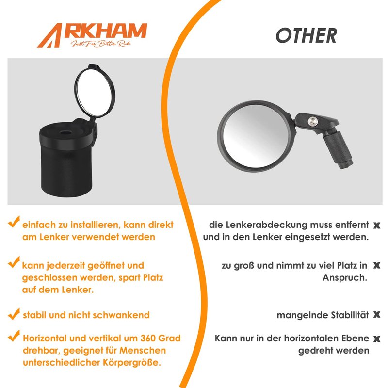 - SAFETY AND STYLE AT THE SAME TIME: The Arkham Mini Folding Bike Mirror adds functionality and safety to your bike without sacrificing looks or performance. Unlike most handlebar mirrors, the Arkham silicone mirror simply attaches to the end of the handlebar. Simply flip the mirror over to get an instant field of view to the rear, then turn it off so no one notices!