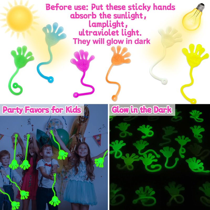 - 28 PCS Glow In The Dark Sticky Hands Toys - You Will Get 28pcs Sticky Hands Toys In 6 Bright Color Come With Orange, Green, White,Blue, Purple, Yellow. It's A Great Choice For Christmas Party Stuff, Christmas Stocking Fillers, Or End Of The Year Gifts For Students.