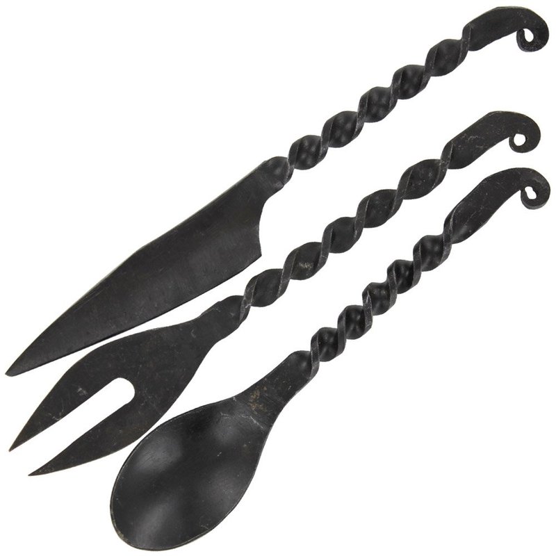 Armory Replicas™ Medieval- Inspired Iron Cutlery Set with Blackened Antique Finish - Knife, Fork, and Spoon for Authentic Camp Dining Experience