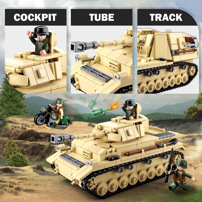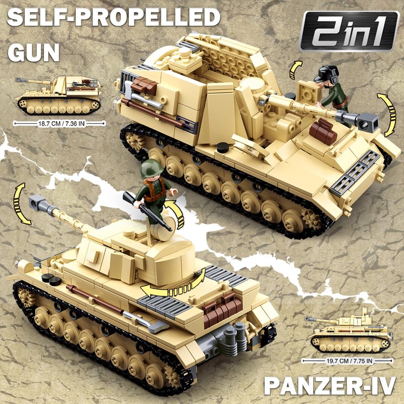 - 【2 in 1 Military WW2 Set】This Panzer IV Tank set includes 3 Soldier Minifigures, 1 military tank, 1 motorcycle and more small parts.2 in 1 tank set, it is compatible with Lego army sets. Boasting a realistic look, it comes with a range of movable accessories, kids can manipulate all the parts to simulate movement and action.